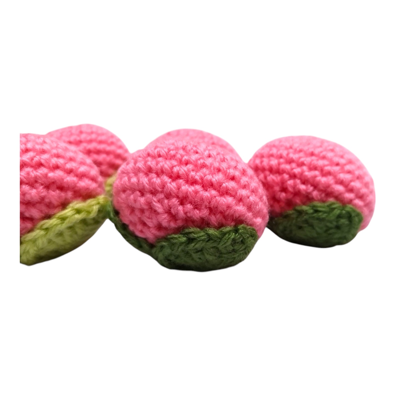 This set of six carefully hand-crocheted peach amigurumi dolls is perfect for any room. Their adorable round shapes and soft pink color will add a touch of warmth to any room. Simply display them in your kitchen or living room as interior décor or photography accessories to brighten up any space.
