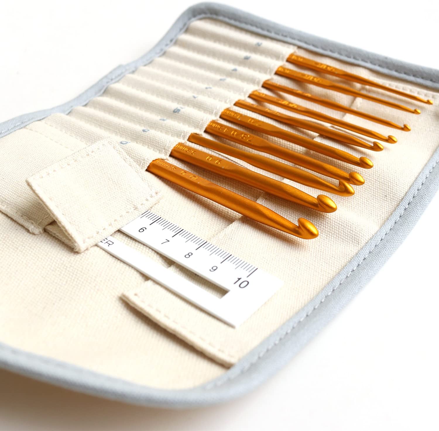 かぎ針10本(2号/2.0mm、3号/2.3mm、4号/2.5mm、5号/3.0mm、6号/3.5mm、7号/4.0mm、7.5号/4.5mm、8号/5.0mm、9号/5.5mm、10号/6.0mm)