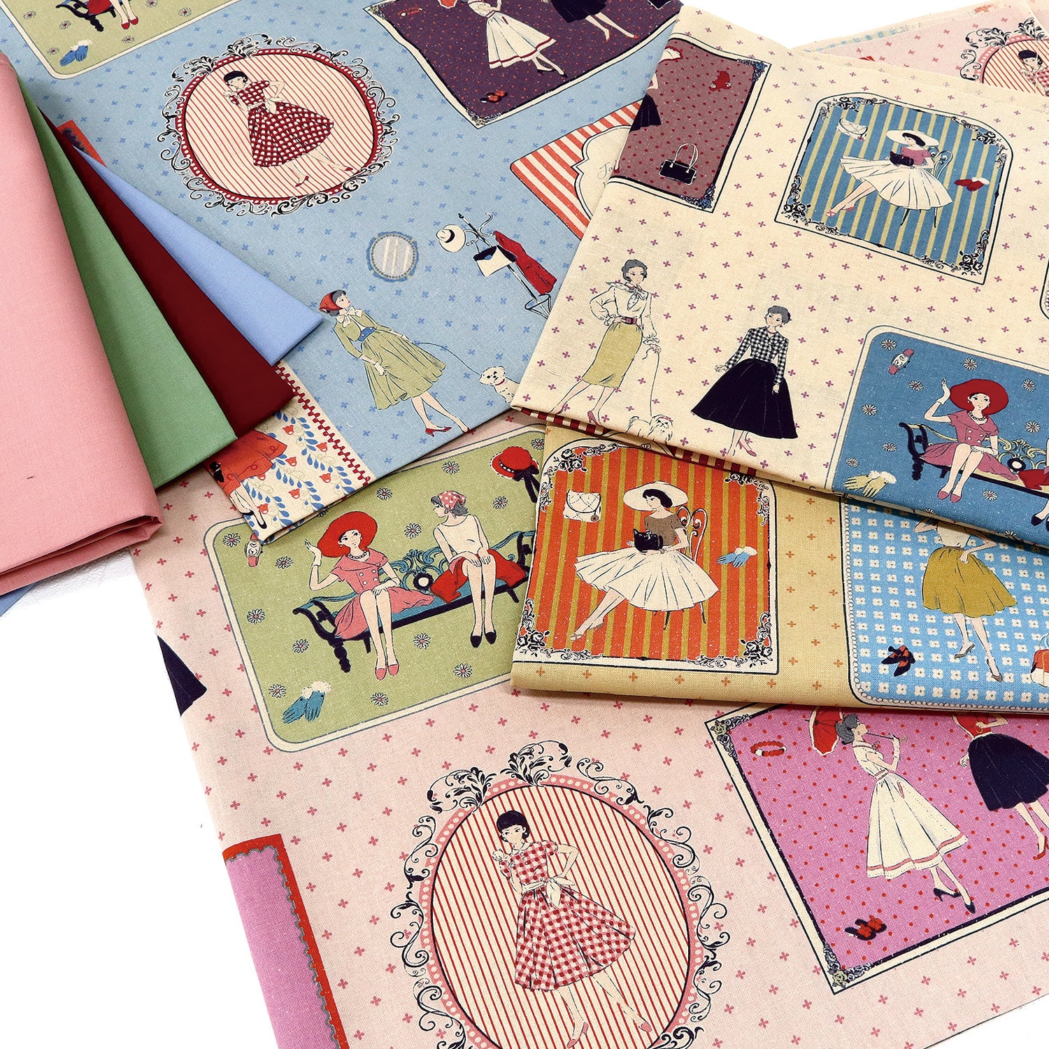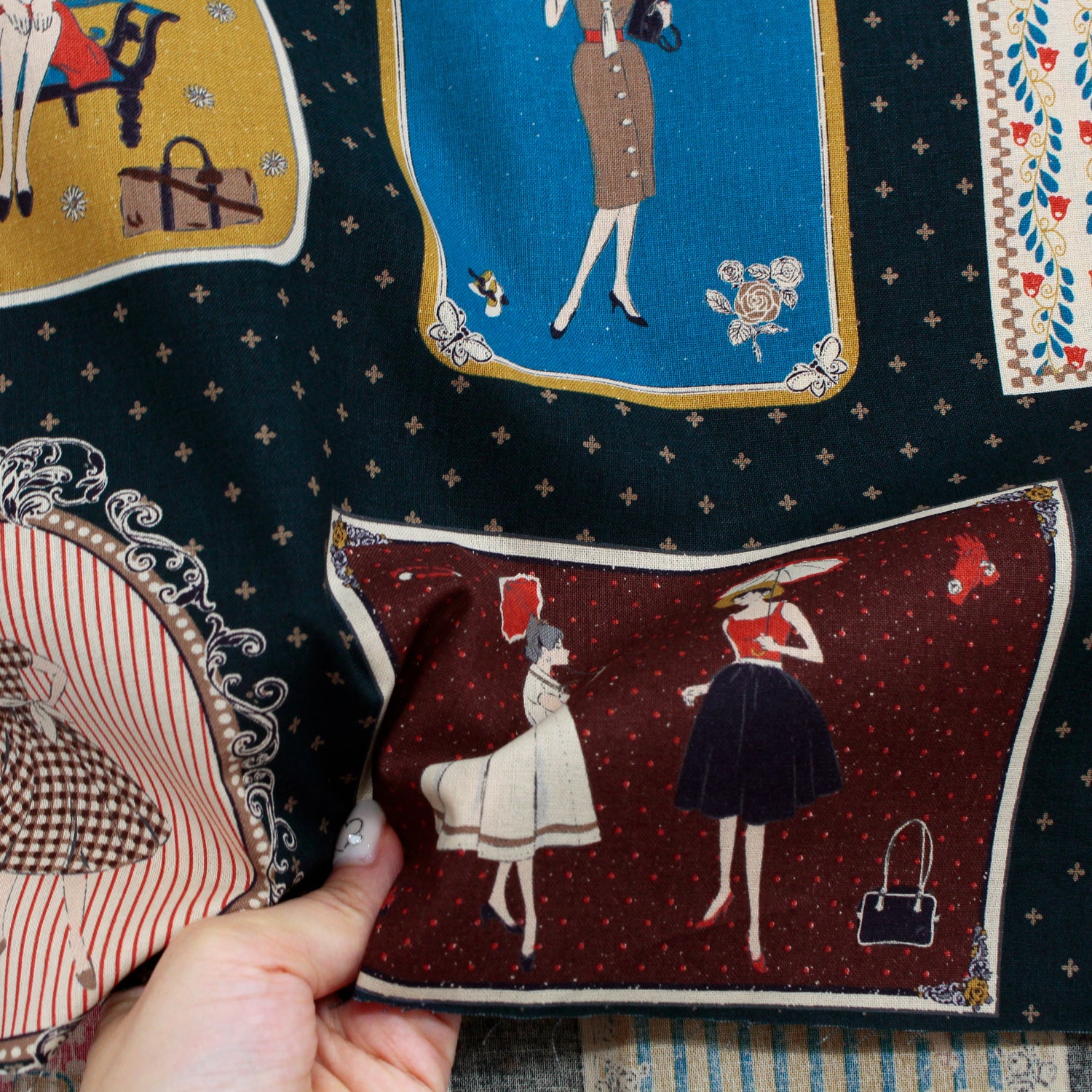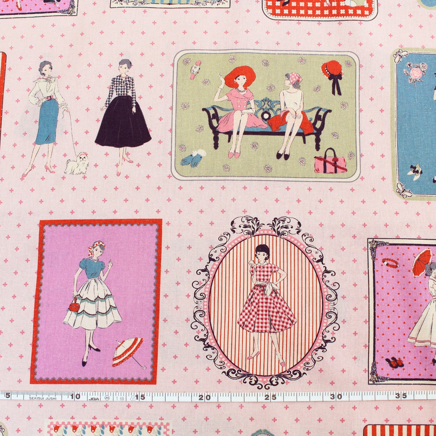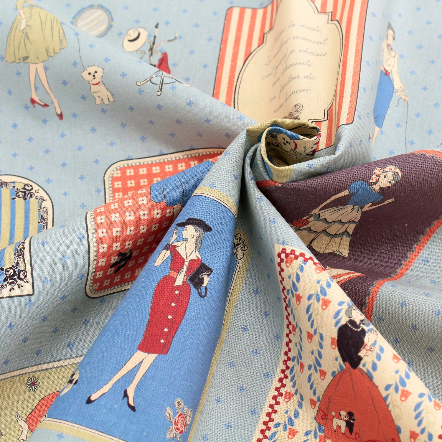 レトロでクラシカルな女の子たちが並ぶ、フランスの古いファッション誌のようなパネル生地