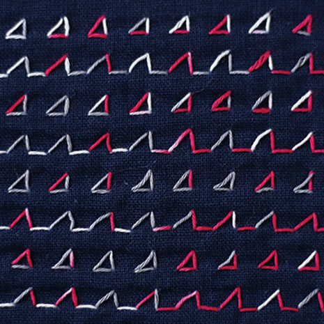 紫・青・白が5〜7cmピッチで染められた3色カスリ染めの刺し子糸です。朝顔の花のような落ち着きと華やかさを兼ね備えた色合いで、刺すたびに色のバランスが楽しめます。白が入っているので、カラーの刺し子布にもしっかり色が映えます。