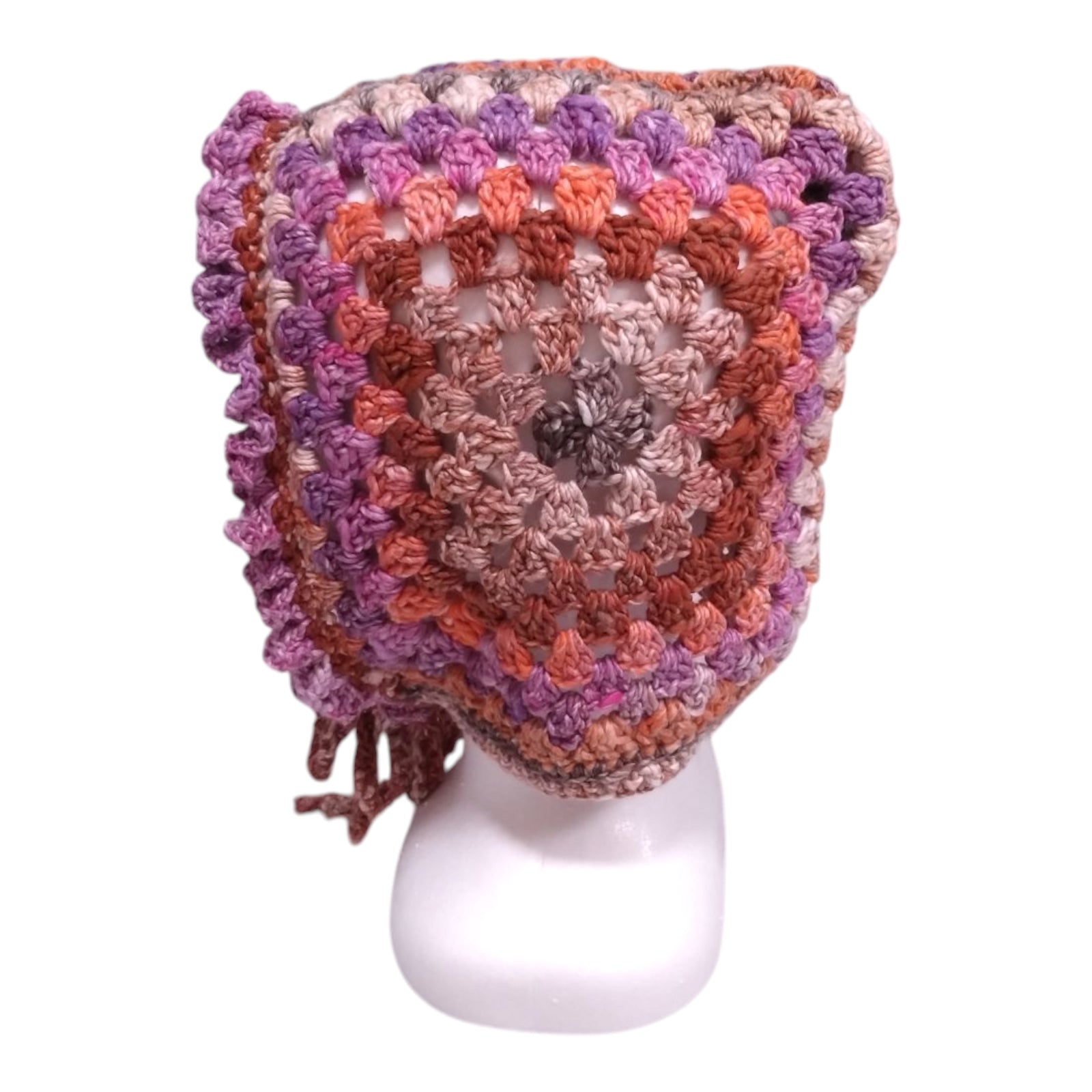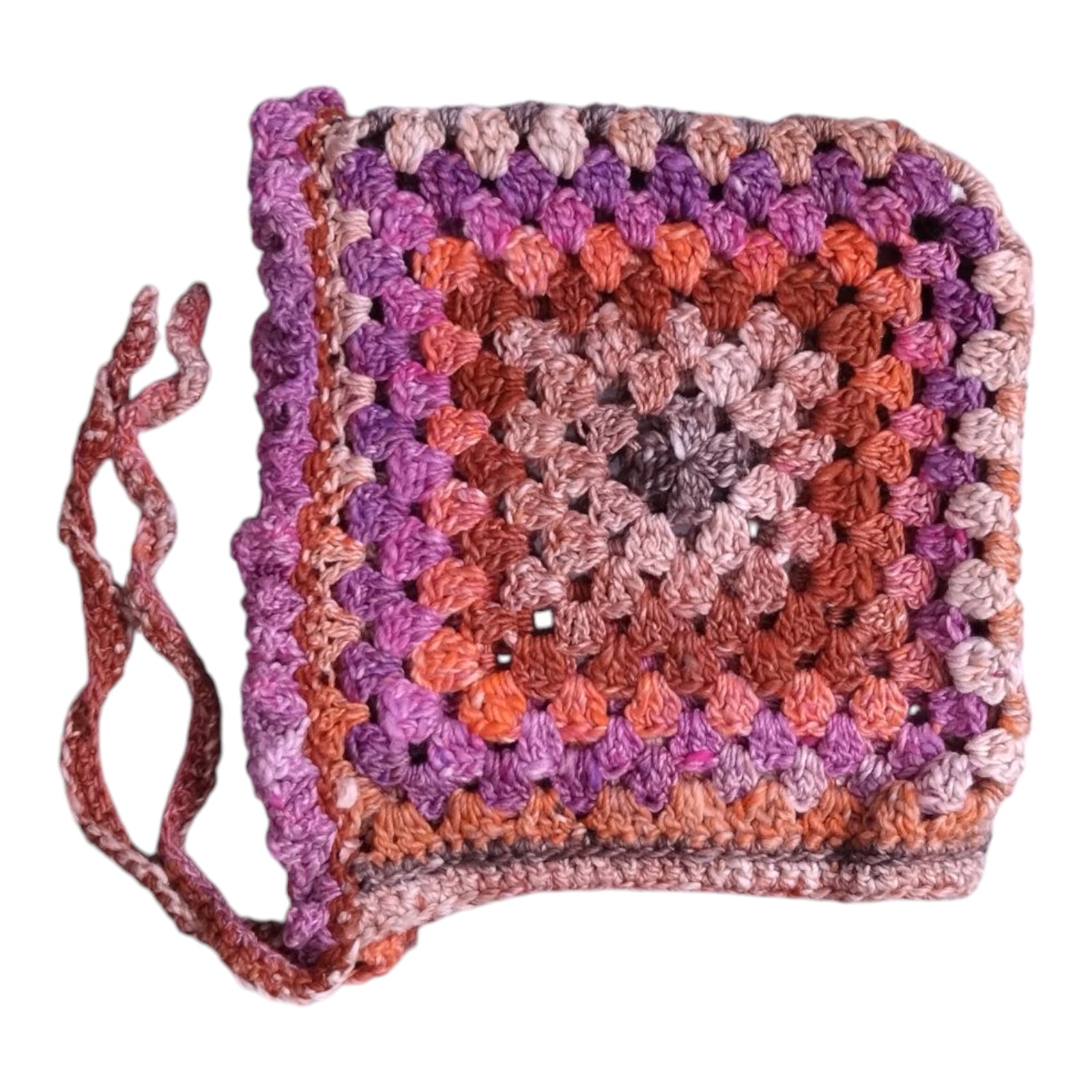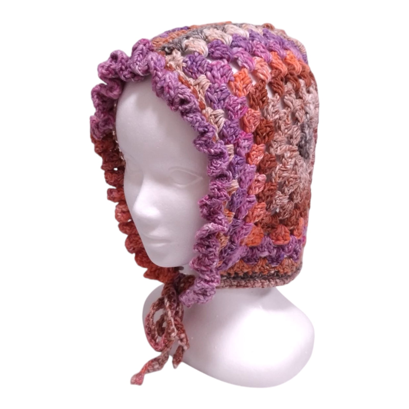 妖精のような愛らしさ、レトロなグラニースクエア編みの大人用ボンネット