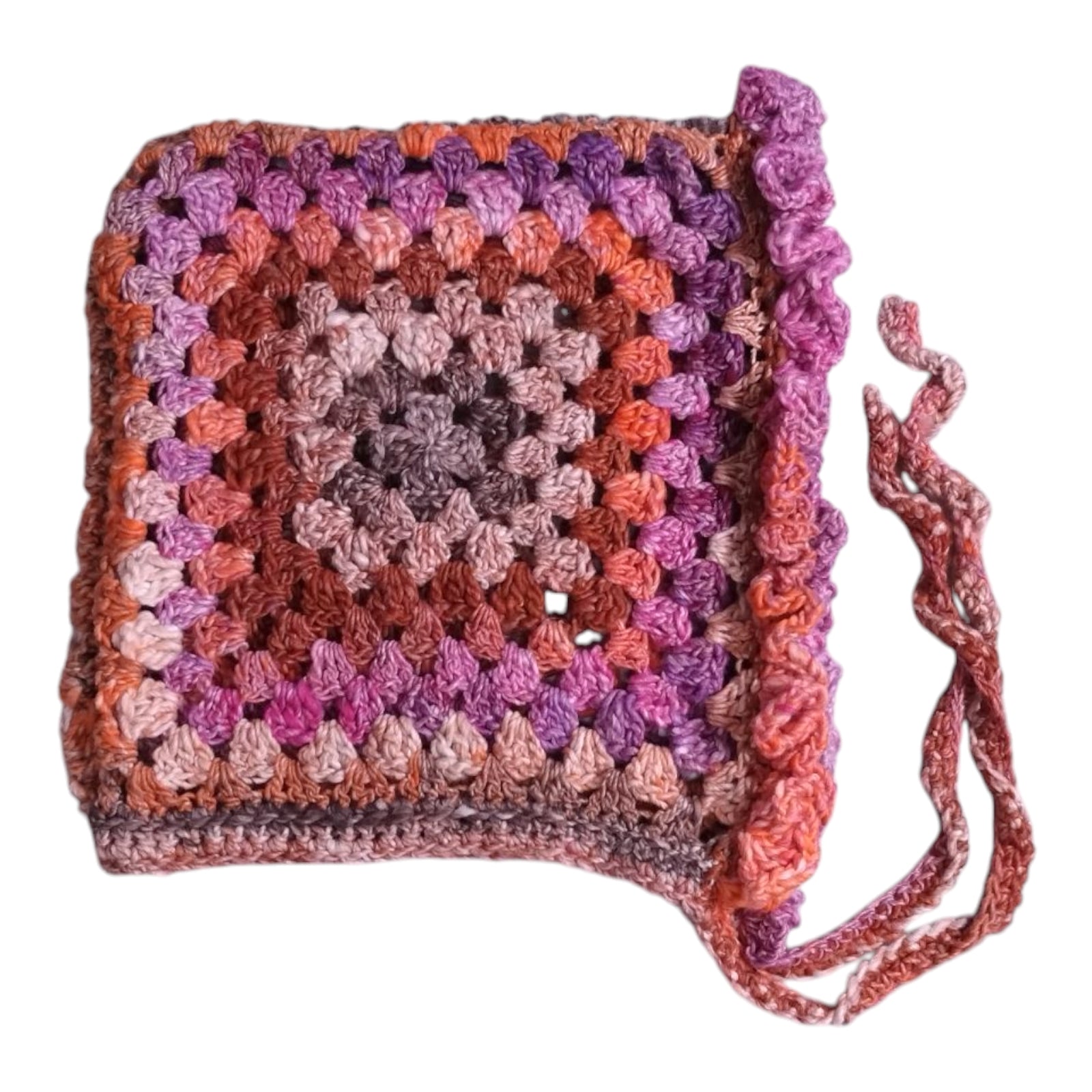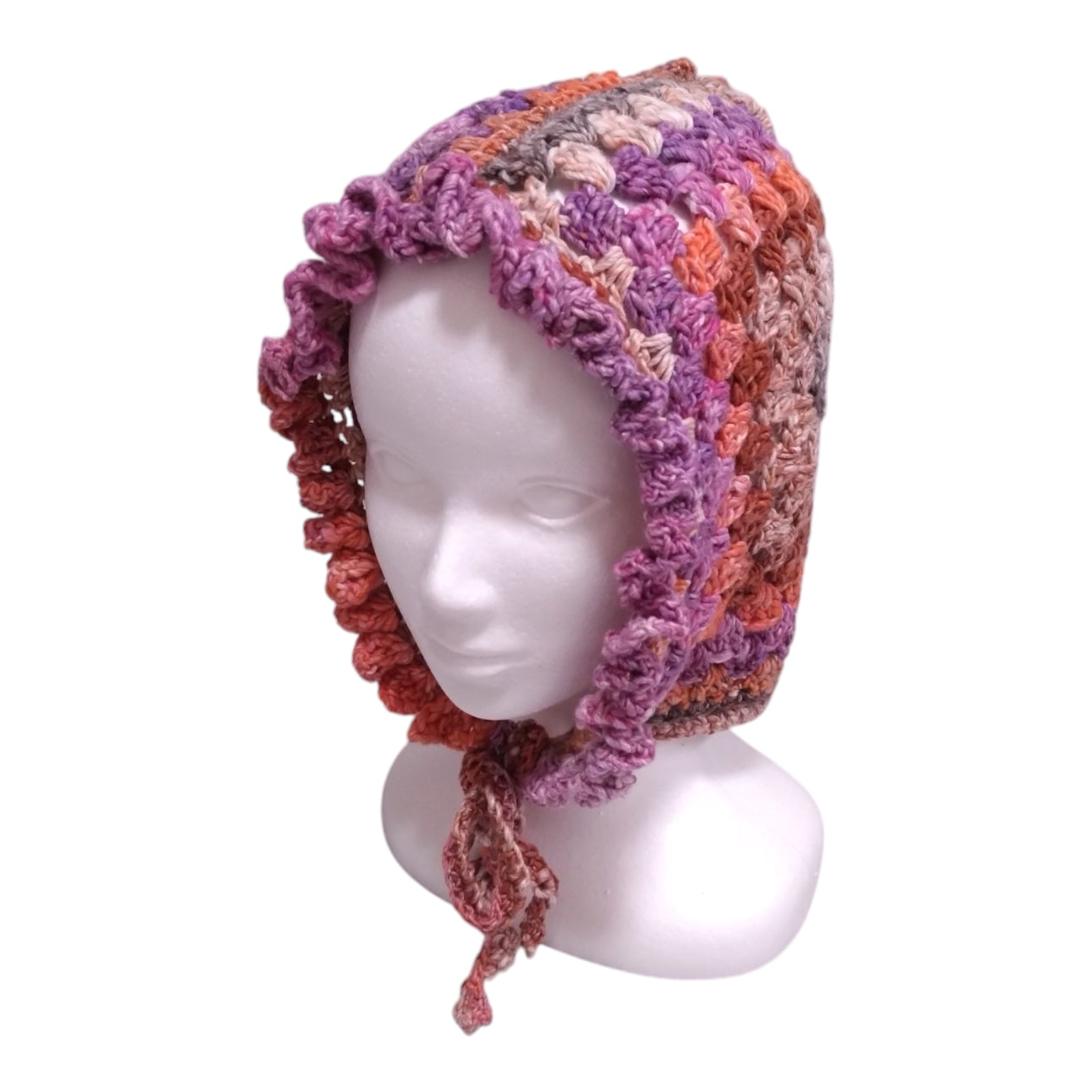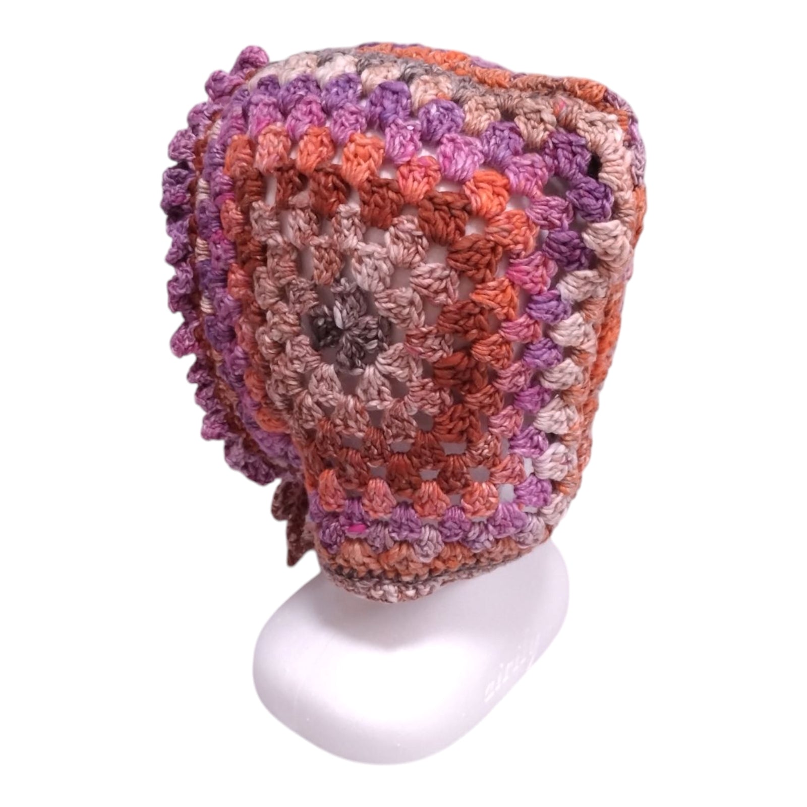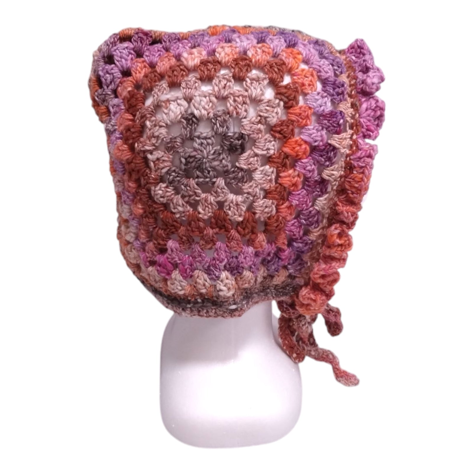妖精のような愛らしさ、レトロなグラニースクエア編みの大人用ボンネット
