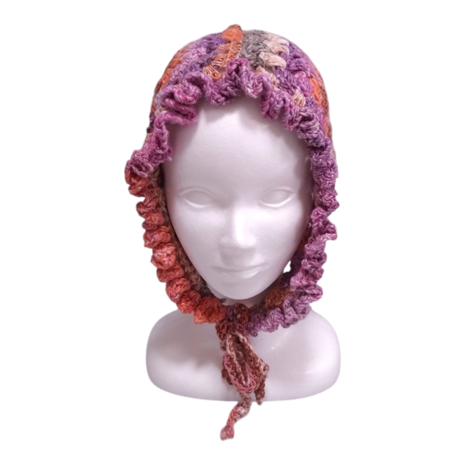 ベビーボンネットの愛らしさを大人向けに再解釈したハンドメイド作品です。レトロな雰囲気漂うグラニースクエア編みと、顔まわりのふんわりフリルが妖精のような柔らかな印象を演出します。