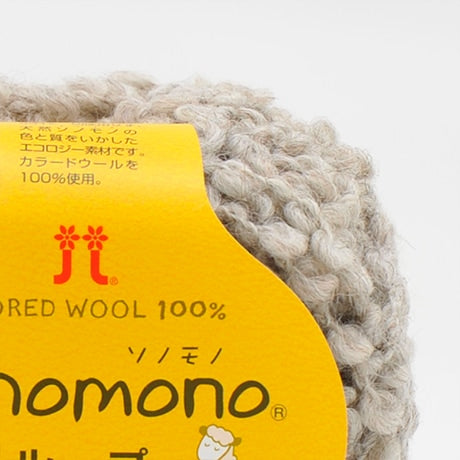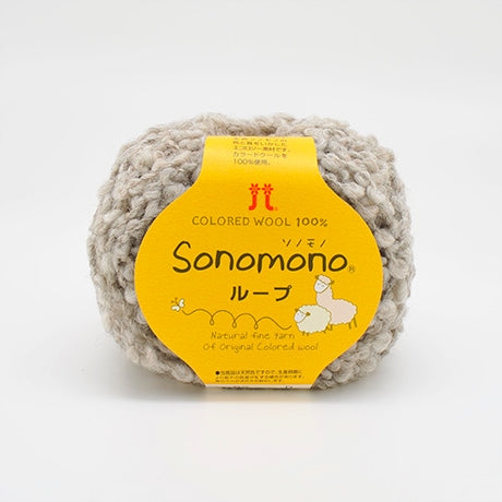 ハマナカ「ソノモノ ループ」。原毛本来の色を活かした、やさしい色合いが魅力の極太毛糸です。ウール60%、アルパカ40%の天然素材で、ふんわりとした軽さとやわらかな肌ざわりが特徴。ループ状の糸構造により、編み地に独特の立体感と表情が生まれます。