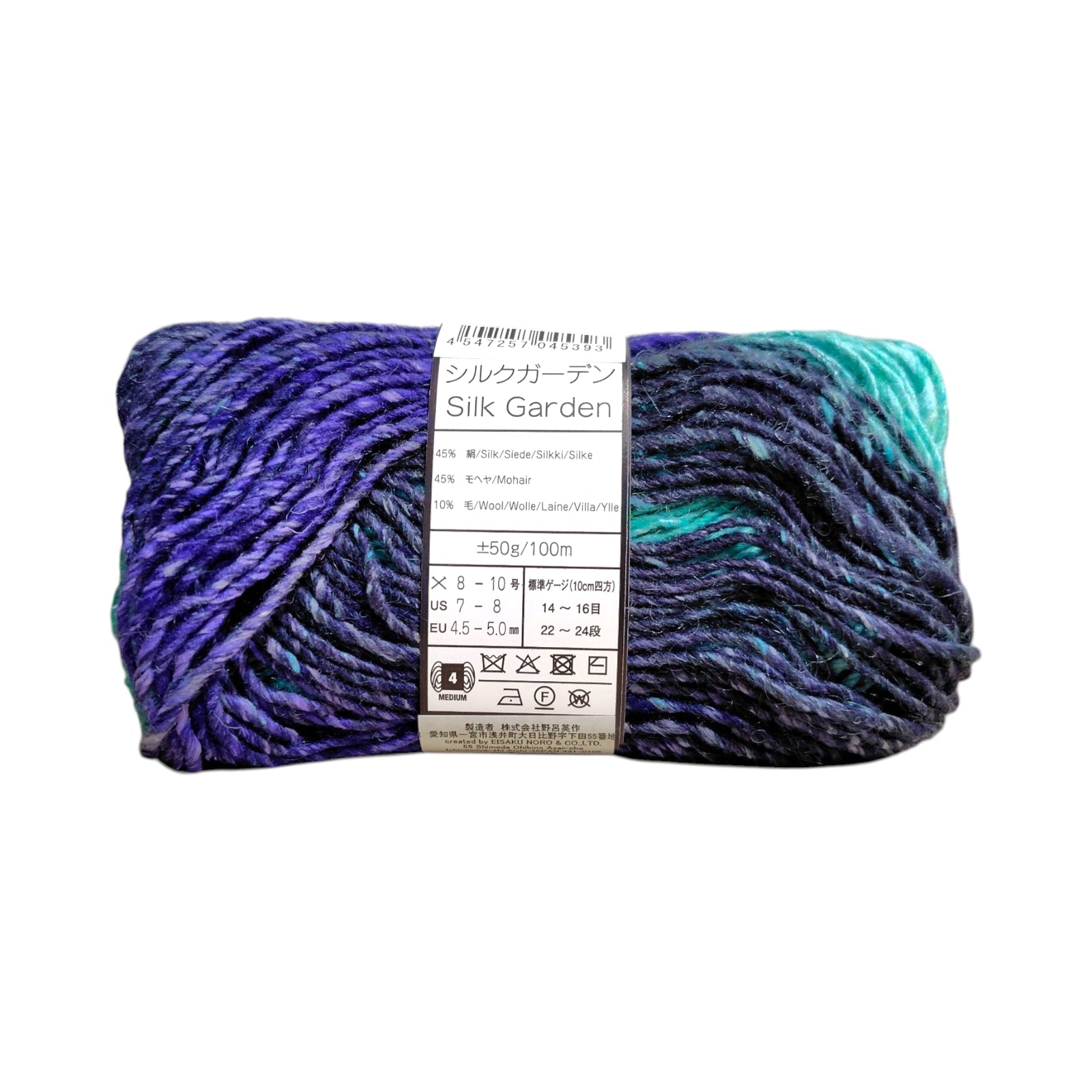 野呂英作の代表作「シルクガーデン」です。ウール45%・シルク45%・モヘア10%の贅沢な3種混紡で、シルクの上品な光沢、ウールの温かさ、モヘアのふんわり感が融合しています。鮮やかな段染めが編むだけで芸術的な作品を生み出します。