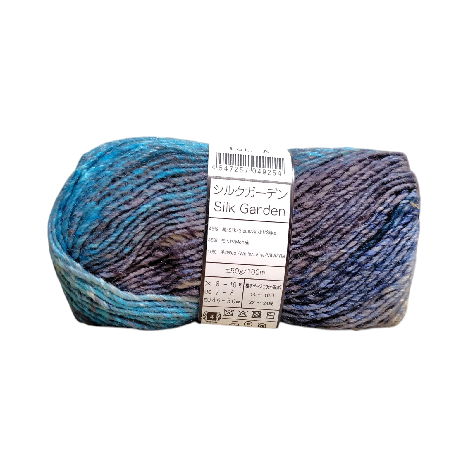野呂英作の代表作「シルクガーデン」です。ウール45%・シルク45%・モヘア10%の贅沢な3種混紡で、シルクの上品な光沢、ウールの温かさ、モヘアのふんわり感が融合しています。鮮やかな段染めが編むだけで芸術的な作品を生み出します。