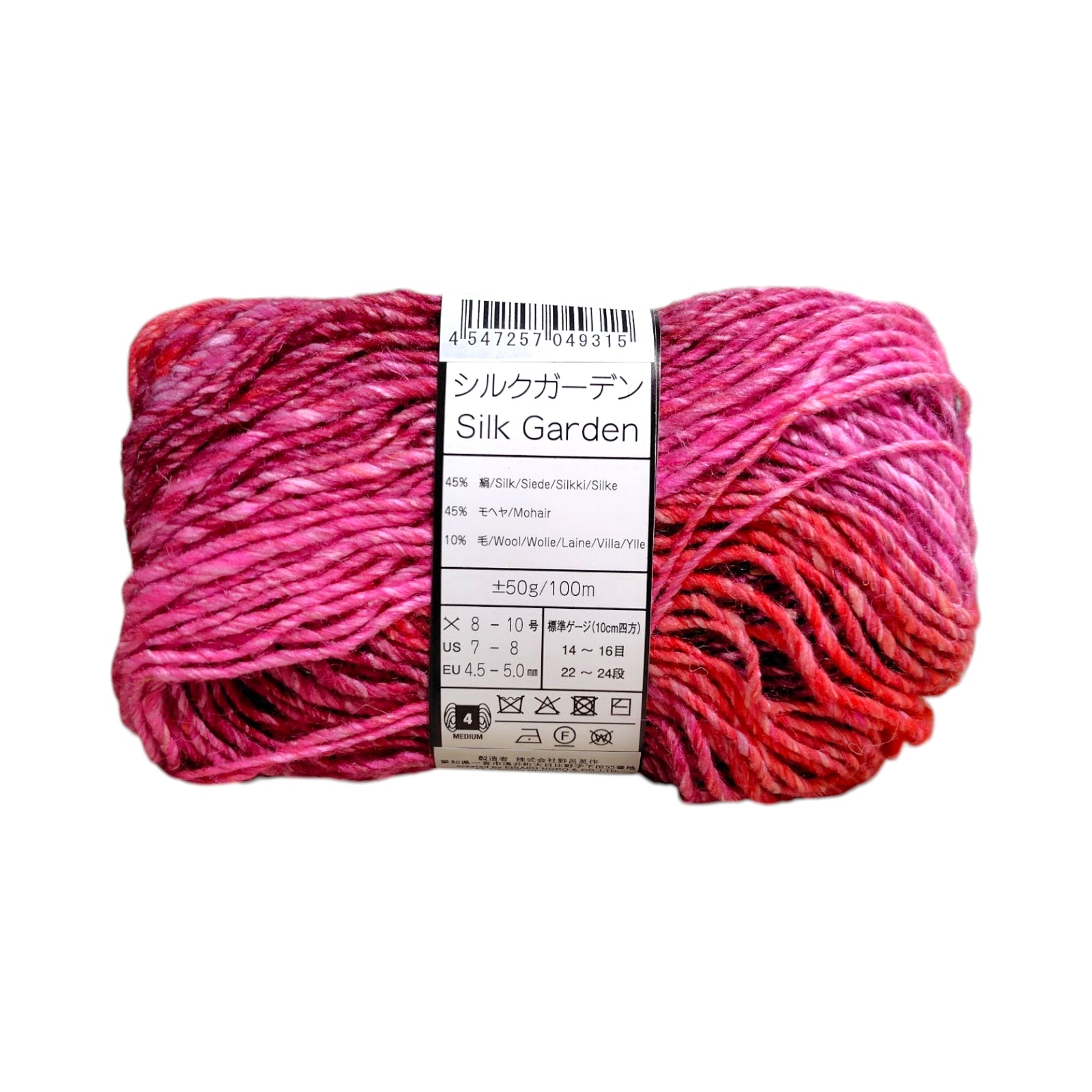 野呂英作の代表作「シルクガーデン」です。ウール45%・シルク45%・モヘア10%の贅沢な3種混紡で、シルクの上品な光沢、ウールの温かさ、モヘアのふんわり感が融合しています。鮮やかな段染めが編むだけで芸術的な作品を生み出します。