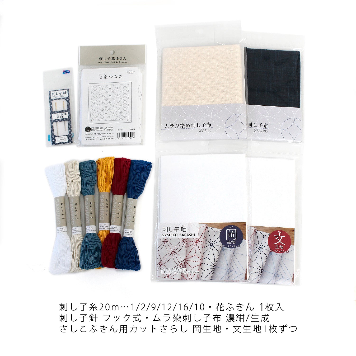 刺し子糸20m×6色(色番号:1・2・9・12・16・10)、花ふきん×1枚、刺し子針フック式×1枚、ムラ染め刺し子布×2枚、さしこふきん用カットさらし×2枚