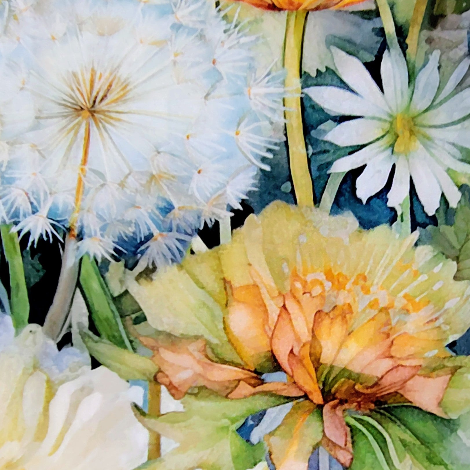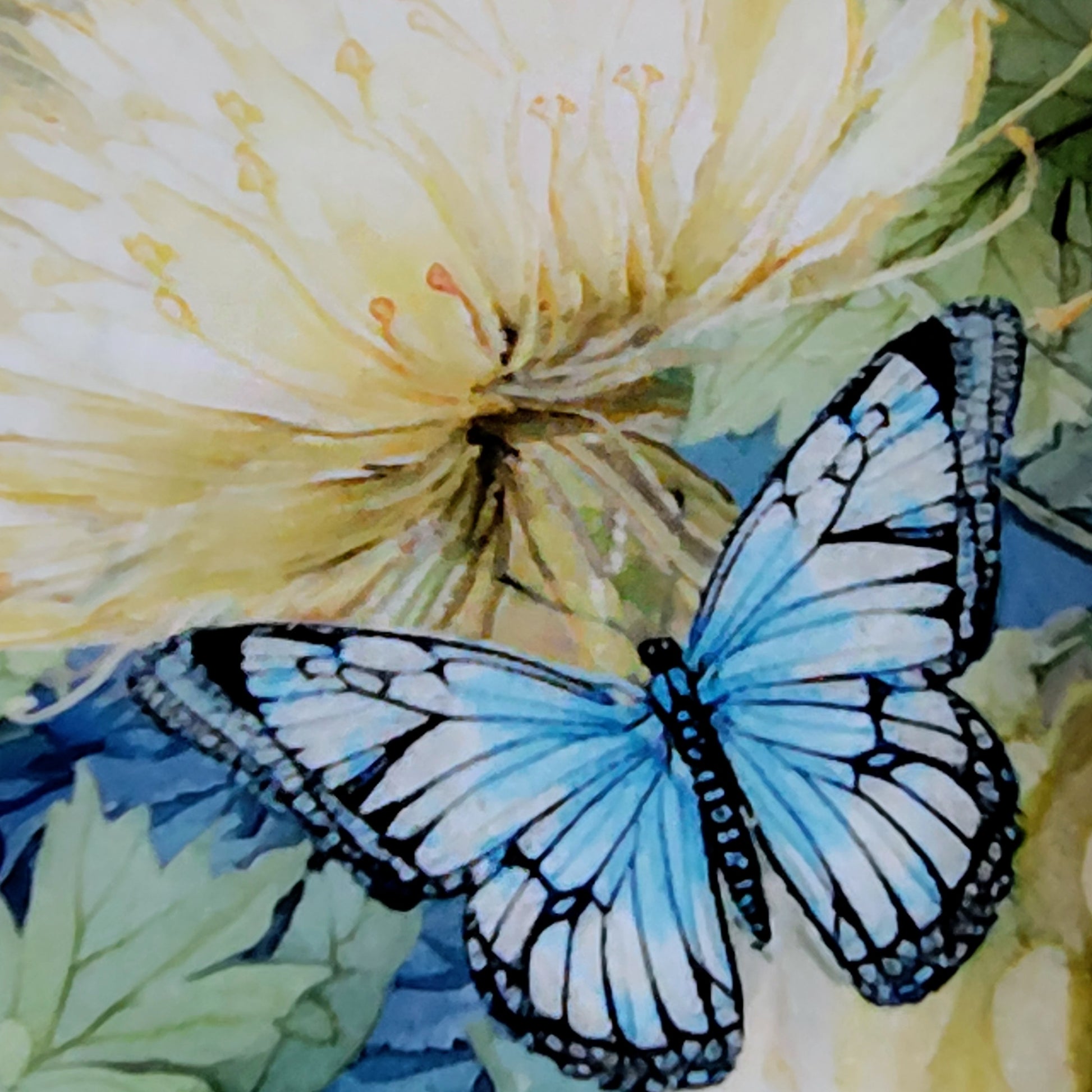 ティールブルーの幻想的な背景に、蝶と草花が舞う癒しのファブリックパネル